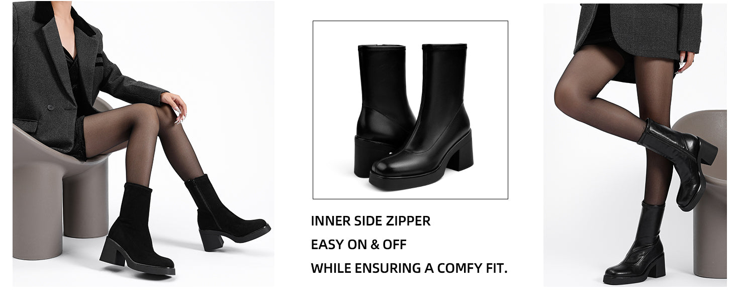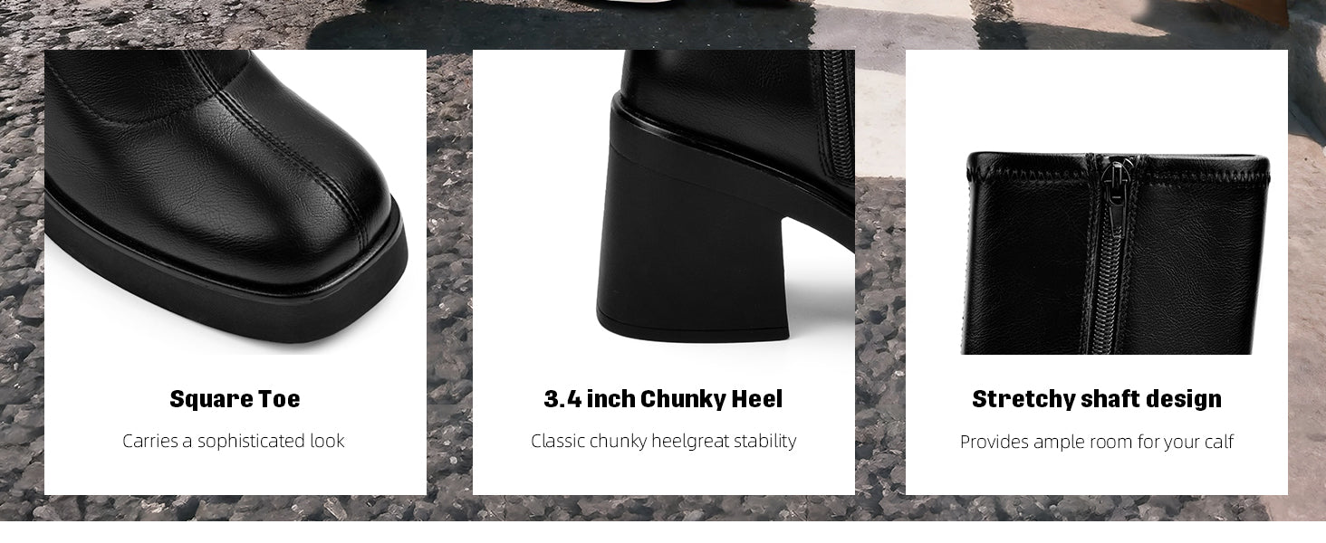 Heel Height: The boots feature a 3.4 inch chunky heel design, perfectly balancing heel height and fashion, confidently suitable