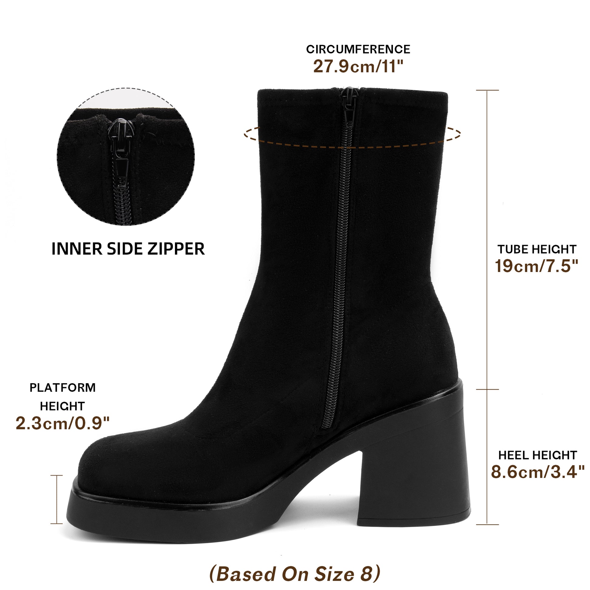 Women's Square Toe Stretch Mid Boots Calf Slouchy Platform Booties Suede Zip Chunky Block Heeled Sock Ankle Boot Shoes